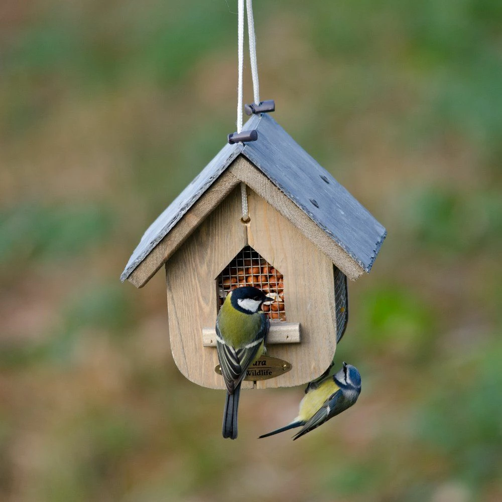 Dieses Futterhaus eignet sich perfekt, um Erdnüsse anzubieten. Die Vögel können von allen Seiten und von unten an das Futter gelangen. Zum Befüllen schieben Sie das Dach einfach nach oben. Das Futterhaus wird inklusive haltbarer Aufhängeschnur geliefert, so dass Sie es sofort an einem geeigneten Platz aufhängen können.