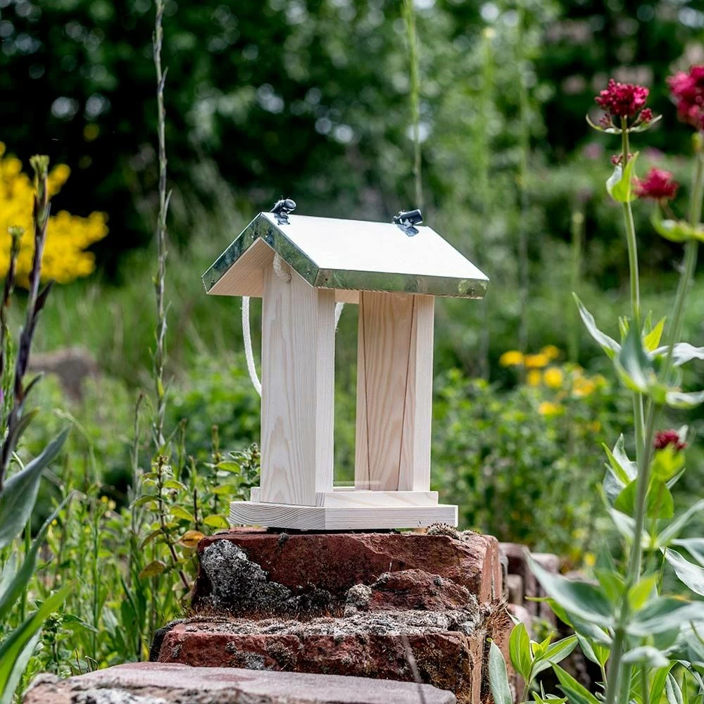 „Das Futterhaus Lathi bietet den Vögeln an beiden Seiten Platz und ist ideal, um verschiedene Futtermischungen anzubieten. Das Haus ist aus weiß getünchtem Holz gefertigt, das Dach ist aus Metall. Durch das Plexiglas seht ihr schon von Weitem, wie viel Futter noch im Futterhaus ist. Und zum Befüllen nehmt ihr einfach das Dach ab.