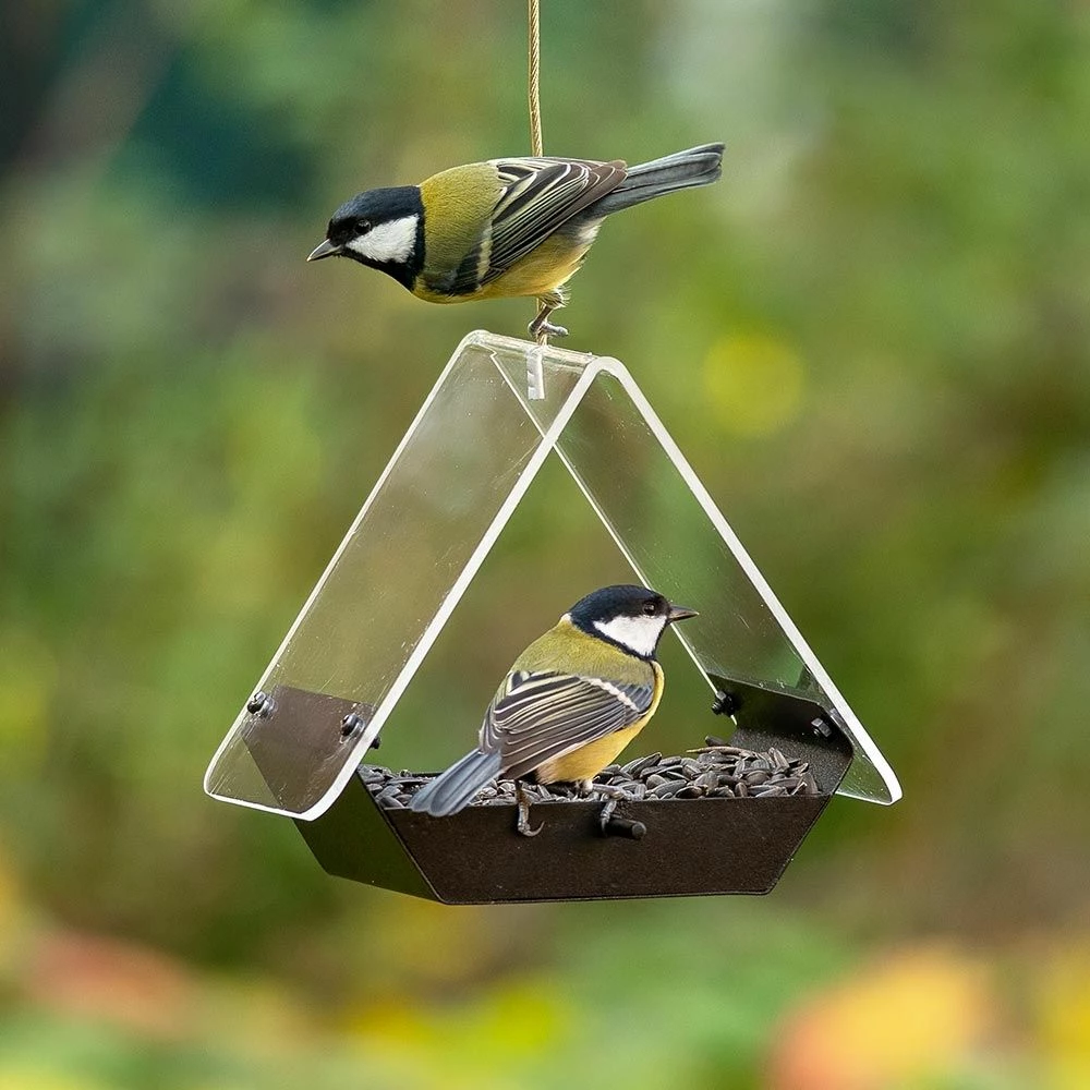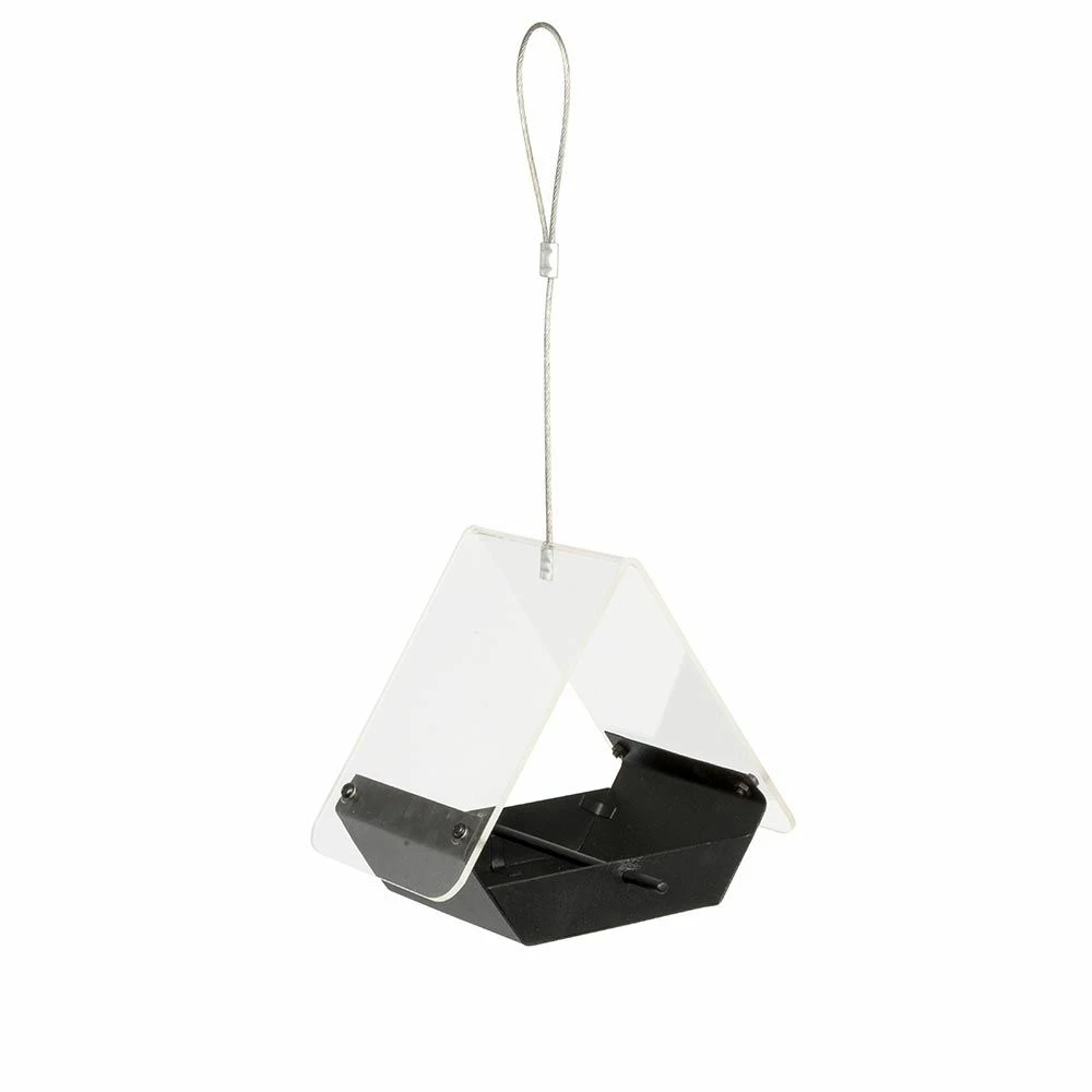 Dieses Futterhaus aus Metall in Hammerschlag-Optik und Plexiglas punktet mit seinem ausgefallenen, modernen Design. Die Besonderheit: Das durchsichtige Dach, mit dem sie die Vögel besonders gut an der Futterstelle beobachten können (ebenso haben die Vögel ihre Umgebung im Blick).