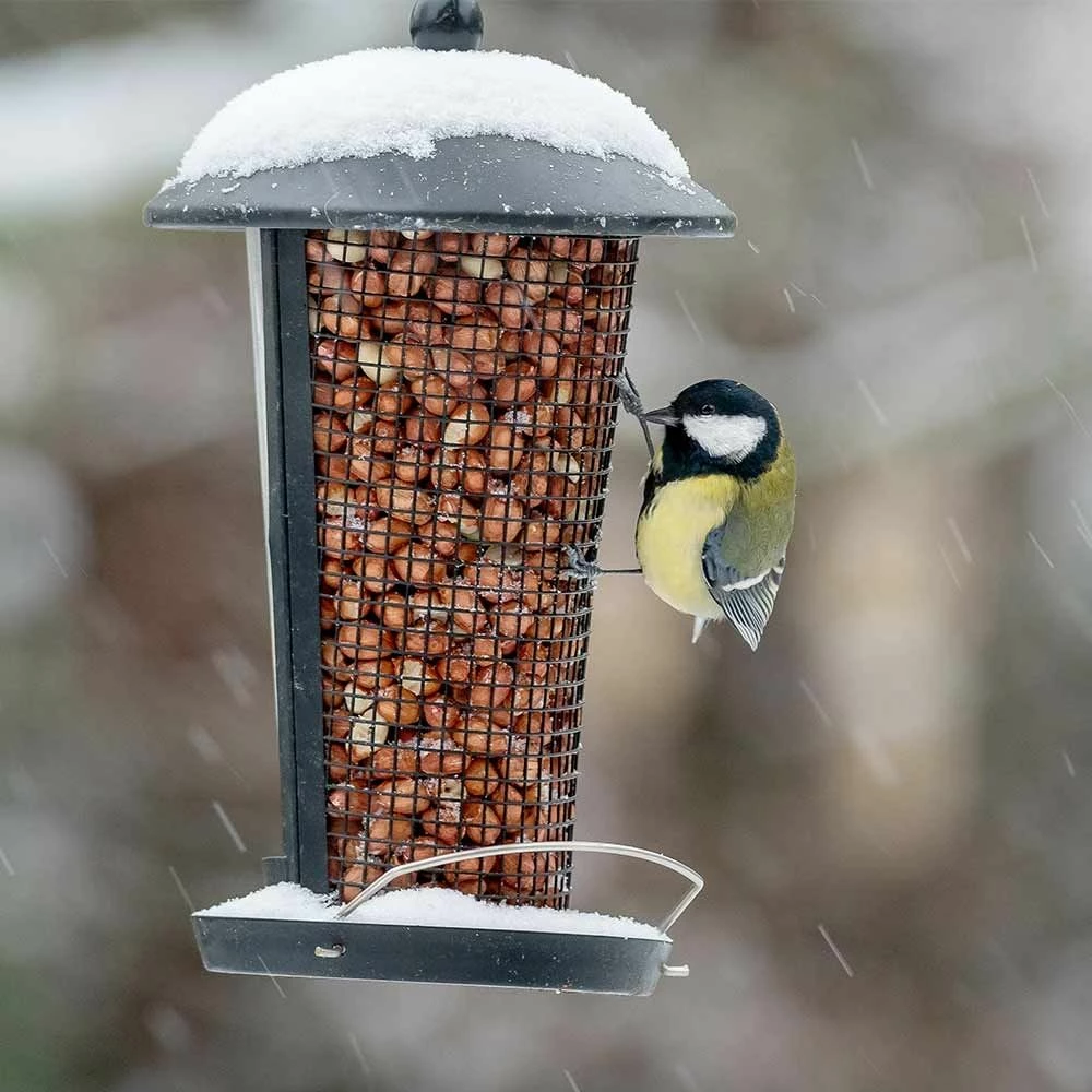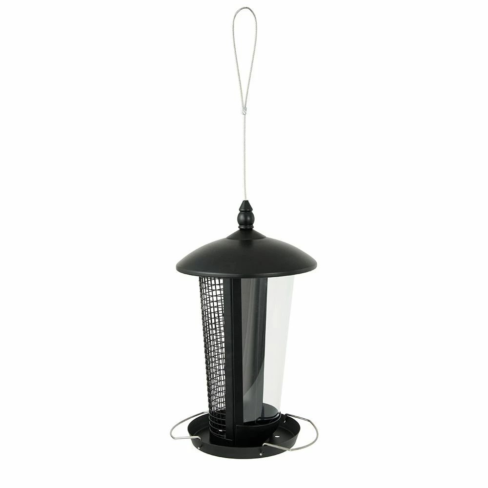 In der Futtersäule „Edessa“ können Sie Ihren Gartenvögeln Futtermischungen und Erdnüsse gleichzeitig anbieten – sie hat nämlich zwei Kammern. Die eine Kammer ist mit einer Polypropylen-Sichtscheibe versehen. Das Futter fällt durch eine Aussparung an der Unterseite in die kleine Schale. Durch das feinmaschige Drahtgeflecht an der anderen Seite können die Vögel problemlos Erdnussstückchen herauspicken. Es wird ihnen jedoch nicht gelingen, ganze Erdnüsse oder allzu große Stücke durch das Drahtgeflecht zu ziehen – Das ist sicherer für die Jungvögel, die daran ersticken könnten.