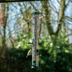 Futtersäulen sind äußerst stabil und haben eine lange Lebensdauer. Die durchsichtigen Futterröhren sind aus UV-beständigem Polycarbonat hergestellt und wurden auf Wetterfestigkeit geprüft, um sämtlichen Witterungsumständen dauerhaft standhalten zu können. Ein großer Vorteil dieser Futtersäulen liegt in der natürlichen Sitzhaltung der Vögel bei der Futteraufnahme: mit dem Kopf nach vorne. Die sechs Futteröffnungen dieser Säule sind nämlich mit einem Sitzring versehen. Ein einzigartiges und zugleich einfaches System, das außerordentlich zweckmäßig ist.