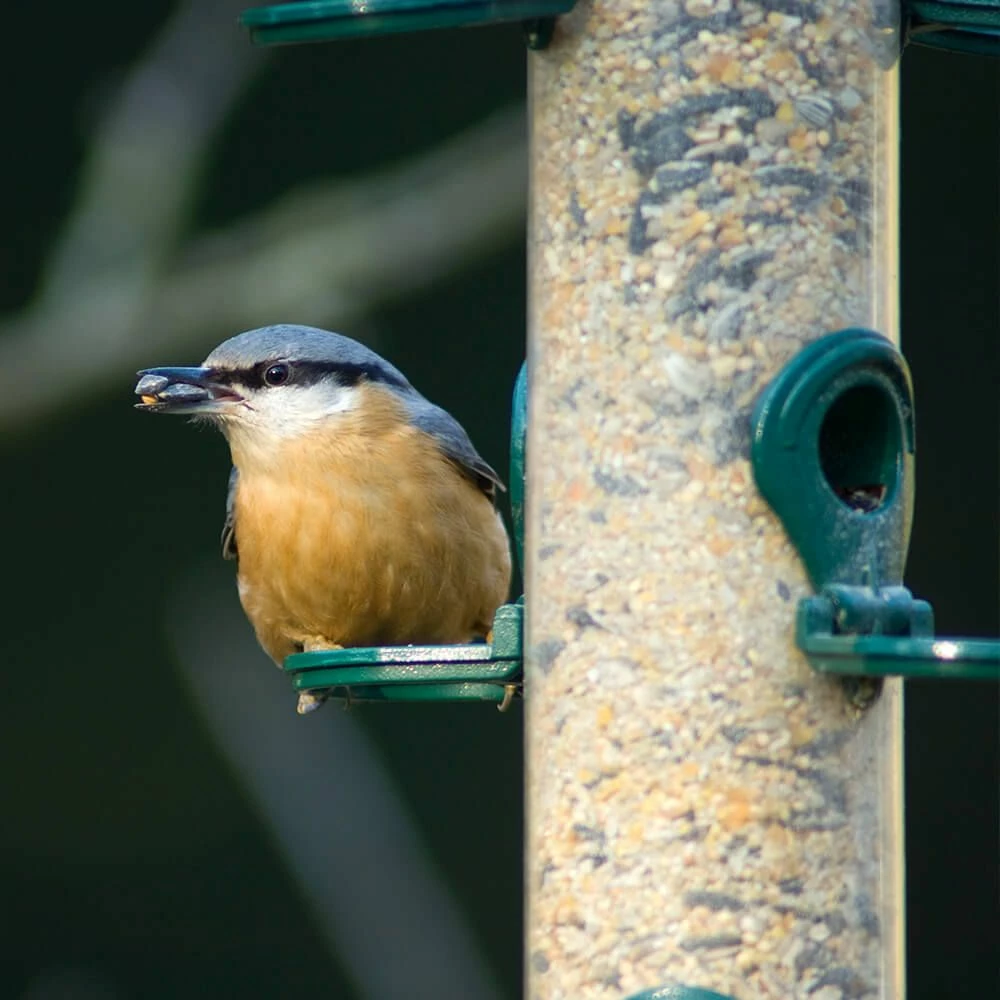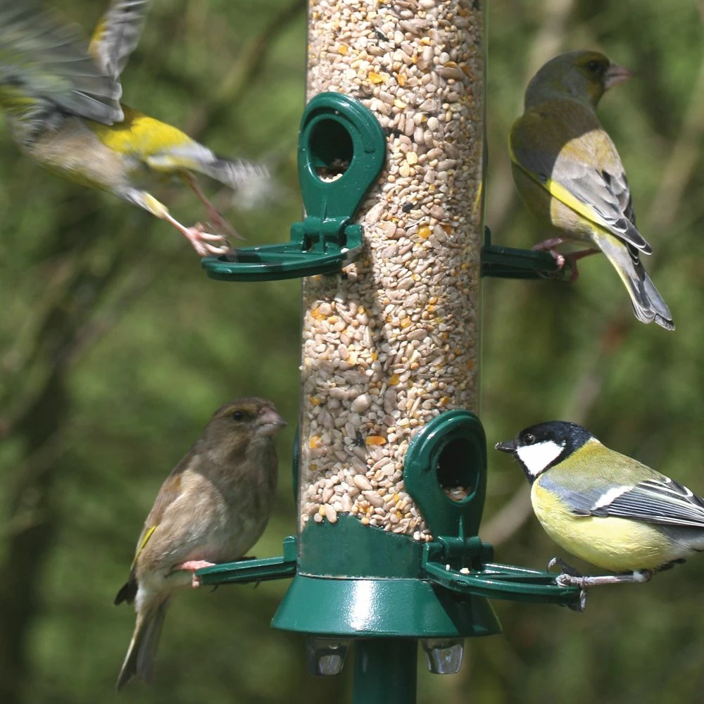 Futtersäulen sind äußerst stabil und haben eine lange Lebensdauer. Die durchsichtigen Futterröhren sind aus UV-beständigem Polycarbonat hergestellt und wurden auf Wetterfestigkeit geprüft, um sämtlichen Witterungsumständen standhalten zu können. Ein großer Vorteil dieser Futtersäulen liegt in der natürlichen Sitzhaltung der Vögel bei der Futteraufnahme: mit dem Kopf nach vorne. Die vier Futteröffnungen dieser Säule sind nämlich mit einem Sitzring versehen. Ein einzigartiges und zugleich einfaches System, das außerordentlich zweckmäßig ist.