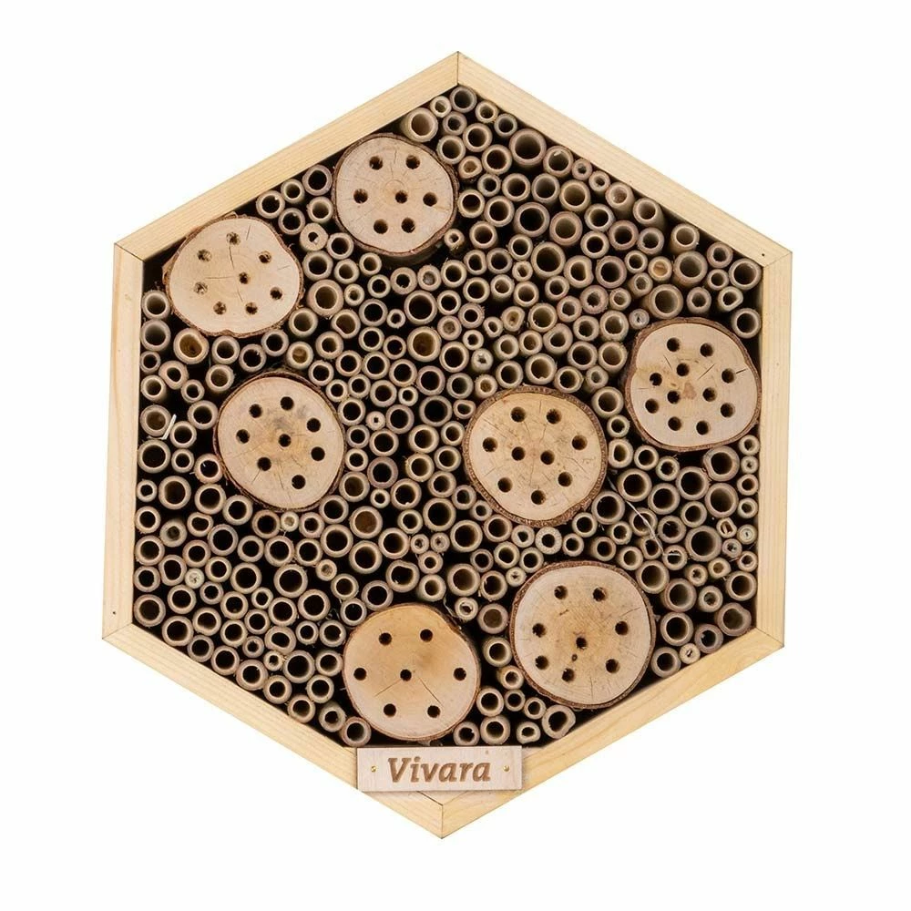 Dieses attraktiv gestaltete Insektenhotel ist ein idealer Unterschlupf für Insekten. So nisten sich Solitärbienen gerne in einem Insektenhotel ein. Sie sammeln Pollen und tragen ihn in die Bambusröhren. Wenn sie genug gesammelt haben, legen sie ein Ei dazu und verschließen die Brutkammer mit einer weiteren Pollenschicht. Danach wiederholt sich der Vorgang und eine neue Brutkammer wird gebaut. Wenn die Brut schlüpft, dient der Pollen ihr als Nahrung und bahnt sich die junge Biene ihren Weg nach draußen, um auszufliegen.