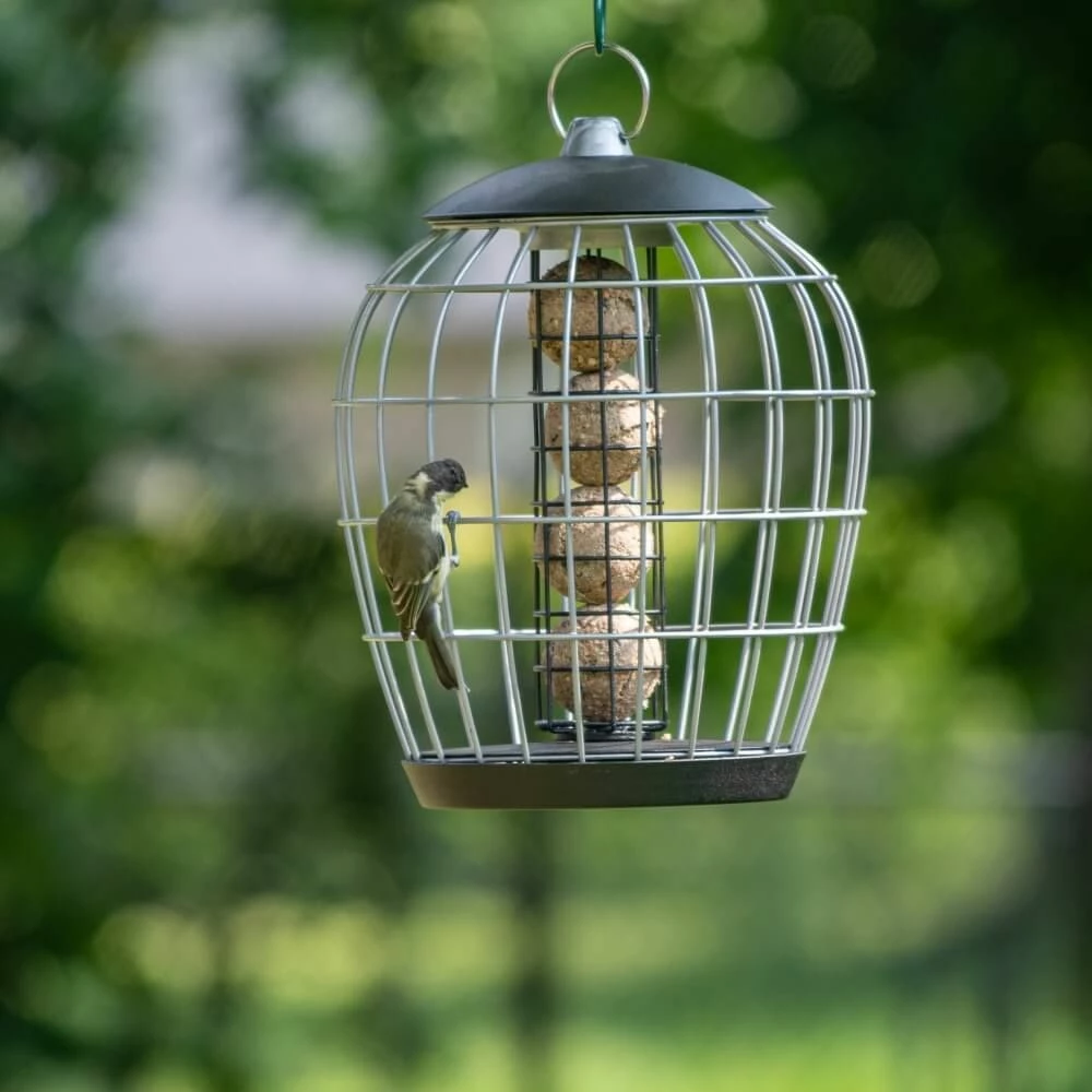 Der Meisenknödelhalter mit Schutzkäfig „Aura“ ist speziell dafür gemacht, kleinen Vögeln Meisenknödel anzubieten. Nur diese Vögel können durch die Gitterstäbe des Schutzkäfigs an das Futter gelangen und sicher und in aller Ruhe fressen.