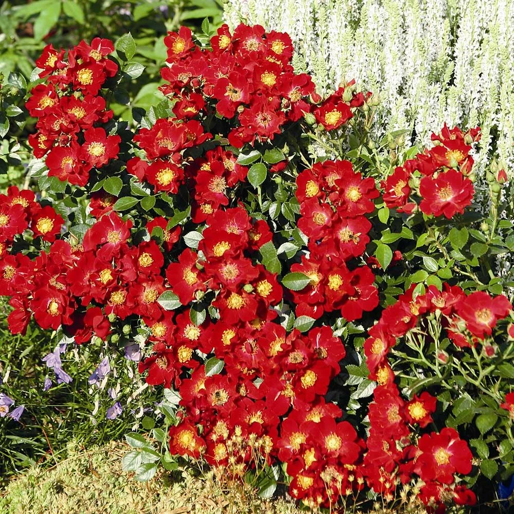 Die Rose wächst kompakt (Breite ca. 40 – 60 cm) und mit schönem, glänzend-grünem Blatt. Sie blüht sehr üppig mit einer hübschen, aufrechten Blüte (Durchmesser ca. 3 cm), deren Staubgefäße für einen reizvollen Kontrast sorgen. Sie ist als leicht duftend einzustufen.