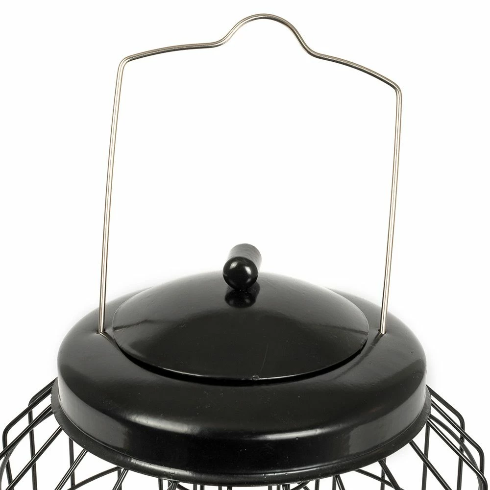Die Schutz-Futtersäule „Brüssel“ besteht aus einer Futtersäule für Saatmischungen mit vier Öffnungen und einem passenden Futtersäulen-Schutz bzw. Schutzkäfig. Der Boden und die Futteröffnungen der Futtersäule sowie der Schutzkäfig mit Deckel sind aus pulverbeschichtetem Metall gefertigt, sodass das Futtersystem wetterbeständig und langlebig ist. Der große Deckel dient nicht nur als Verschluss, sondern auch als Dach, sodass das Futter vor Regen und Schnee besser geschützt ist.