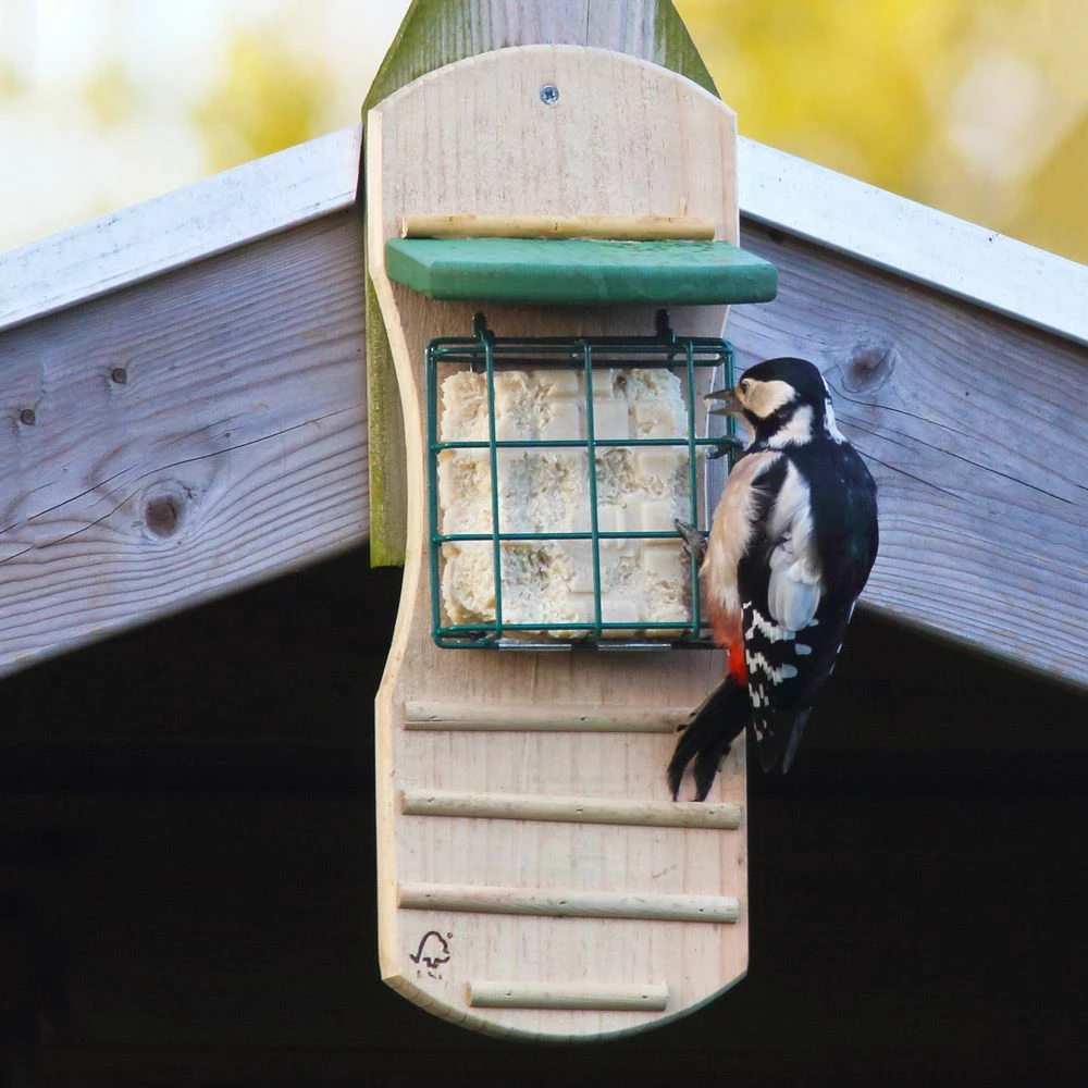 Dieser Energieblockhalter wurde so gestaltet, dass auch Spechte perfekten Zugang zum Futterblock haben. Der untere Abschnitt bietet ausreichenden Halt und eine gute Abstützhilfe für den Schwanz der Spechte, sodass sie ausgiebig von dem Energieblock fressen können. Dieses Futterhaus aus Holz kann aufgehängt oder an einer Wand montiert werden und ist für ein Energieblock geeignet.