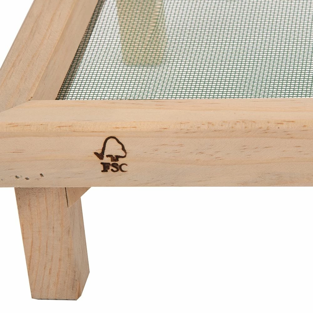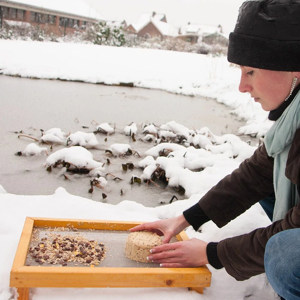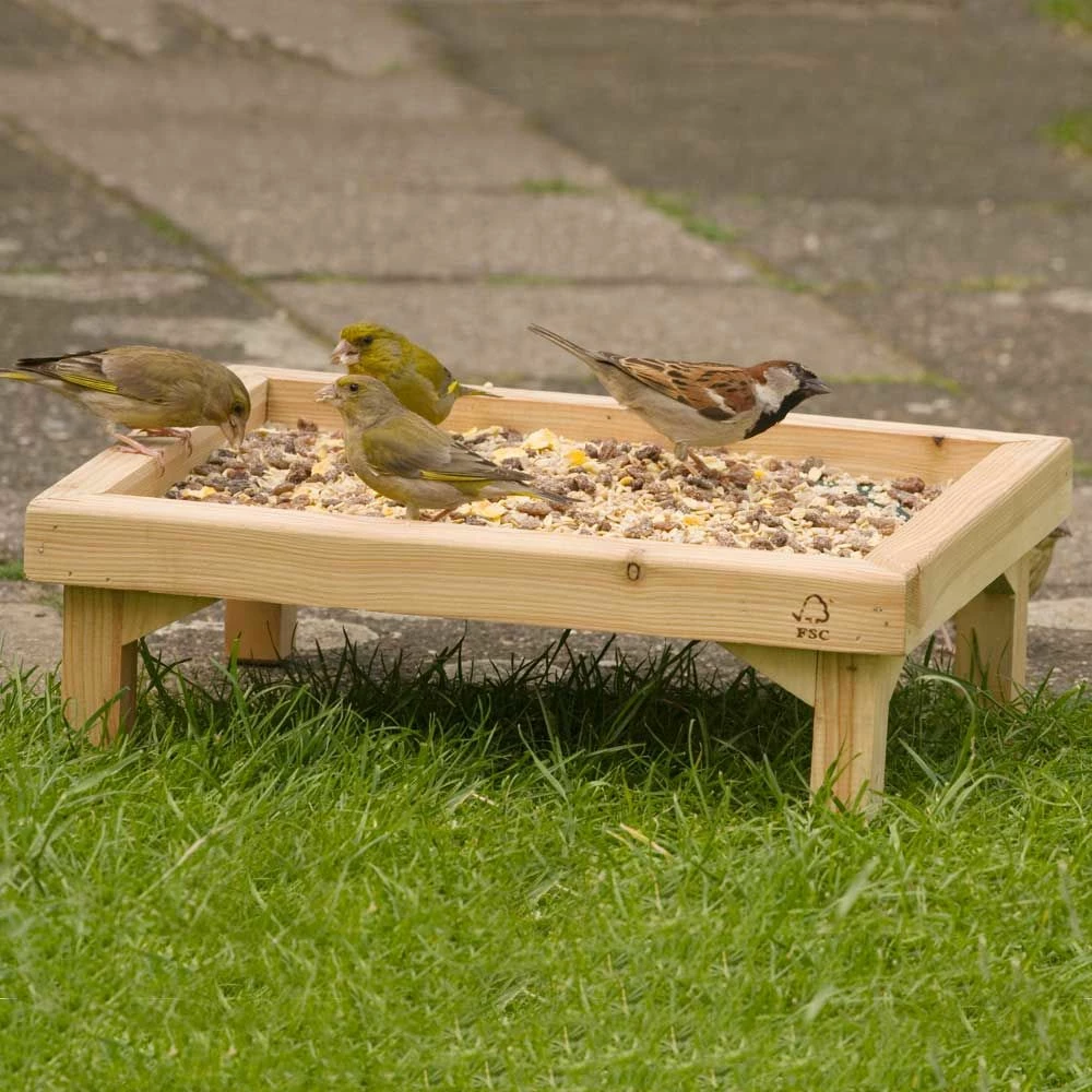 Dieser stabile Futtertisch aus Holz hat eine feinmaschige Unterseite, die aus einem Metallnetz gefertigt ist, damit Regenwasser schnell ablaufen kann. Vor allem Bodenfresser wie Amsel und Rotkehlchen werden Saatmischungen von diesem Futtertisch fressen. Die einfache Reinigung, die täglich erfolgen sollte, sorgt für eine gute Hygiene an der Futterstelle.